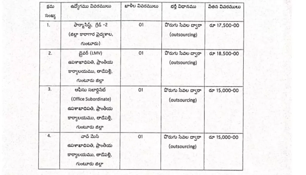 AP Prisons Department Notification 2025 : ఆంధ్రప్రదేశ్ రాష్ట్రం గుంటూరు జిల్లా జైళ్ల శాఖ నుంచి ఉద్యోగాల భర్తీ కోసం నోటిఫికేషన్ విడుదలైంది. ఔట్ సోర్సింగ్ ప్రాతిపదికన ఫార్మసిస్ట్, ఆఫీస్ సబార్డినేట్, వాచ్ మన్, డ్రైవర్ పోస్టులను భర్తీ చేస్తున్నారు. మొత్తం 4 పోస్టులు ఖాళీగా ఉన్నాయి. ఆసక్తి గల మరియు అర్హత కలిగిన అభ్యర్థులు సెప్టెంబర్ 29వ తేదీలోపు పోస్టు ద్వారా లేదా కొరియర్ ద్వారా అప్లికేషన్లు సమర్పించాలి.